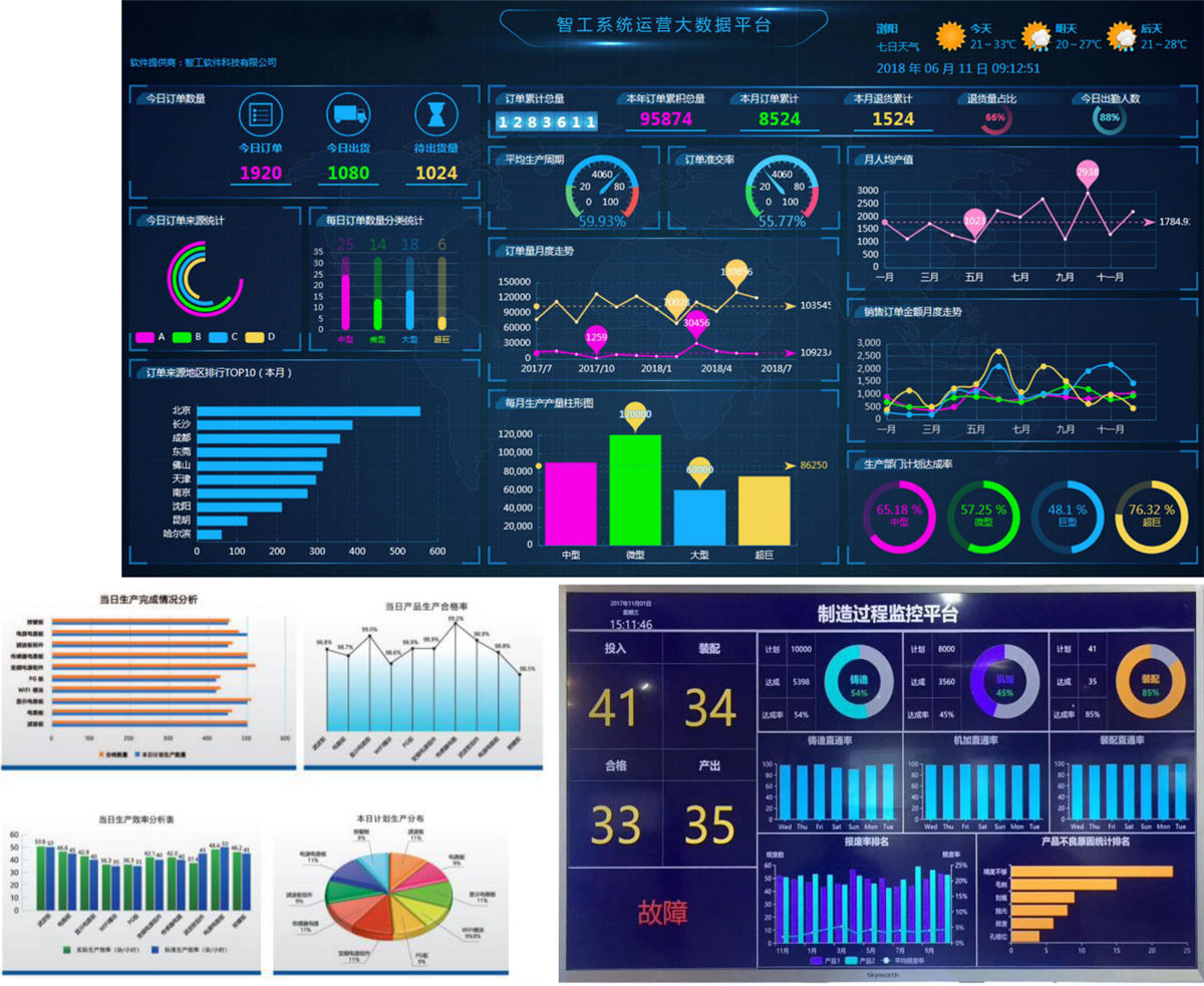 生产电子看板包括:运营大数据平台、异常生产现场状态监控及求助信息、制造过程数据分析图表监控、设备监控、通知公告等功能,数据实现,全程实时监控。 生产线的制造过程。
